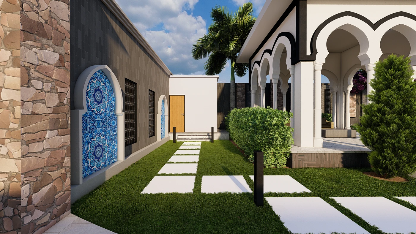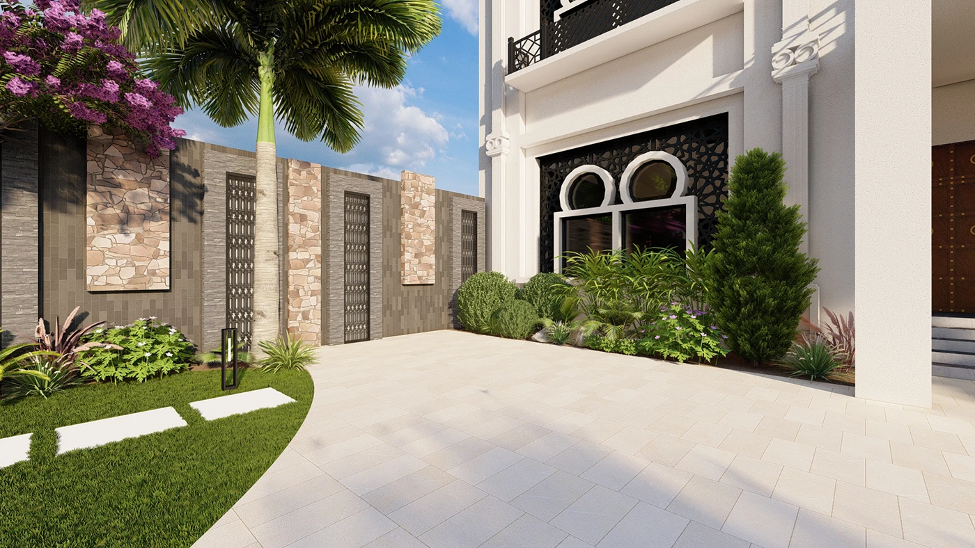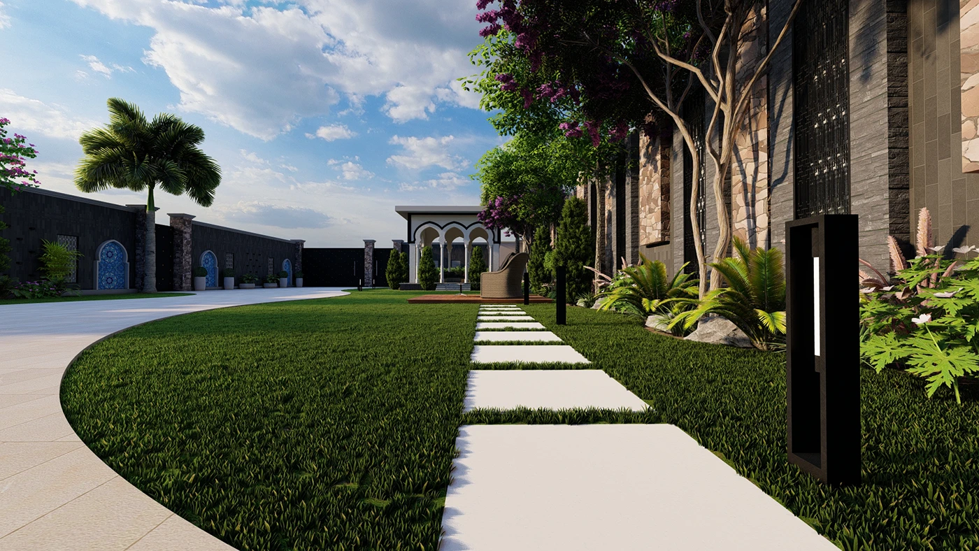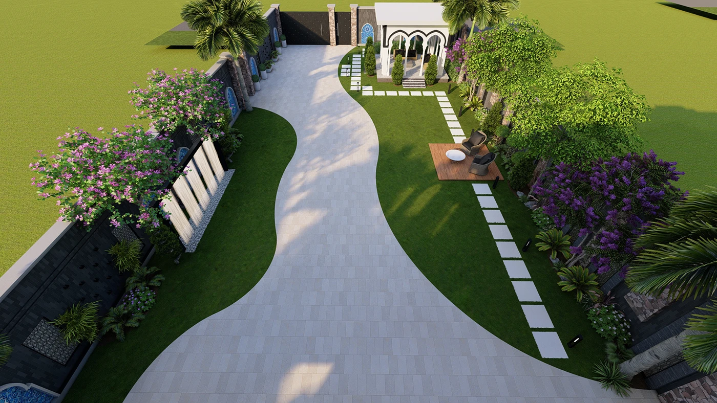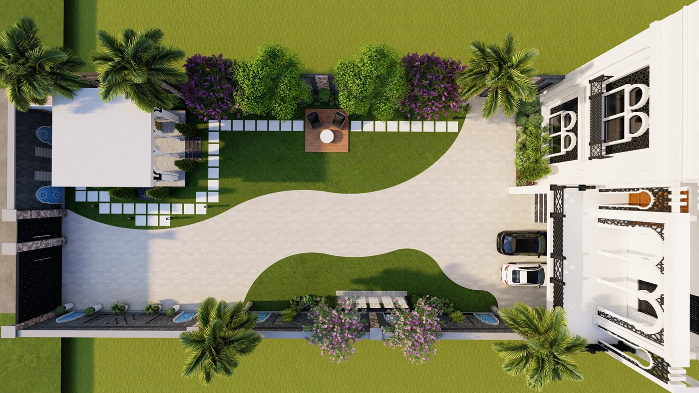 Home Lawn, Bara Dari Sitting Area, Open Sitting Deck, Stone Pathway, Driveway, Waterfall, Feature Wall, Pots, Enterance Gate, Korean Carpet Grass