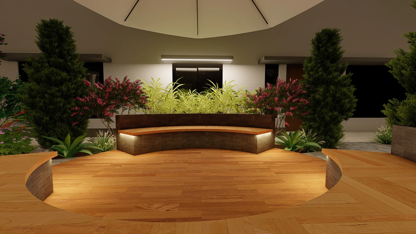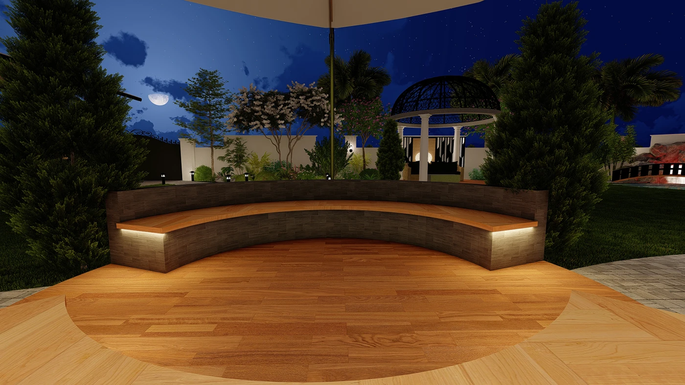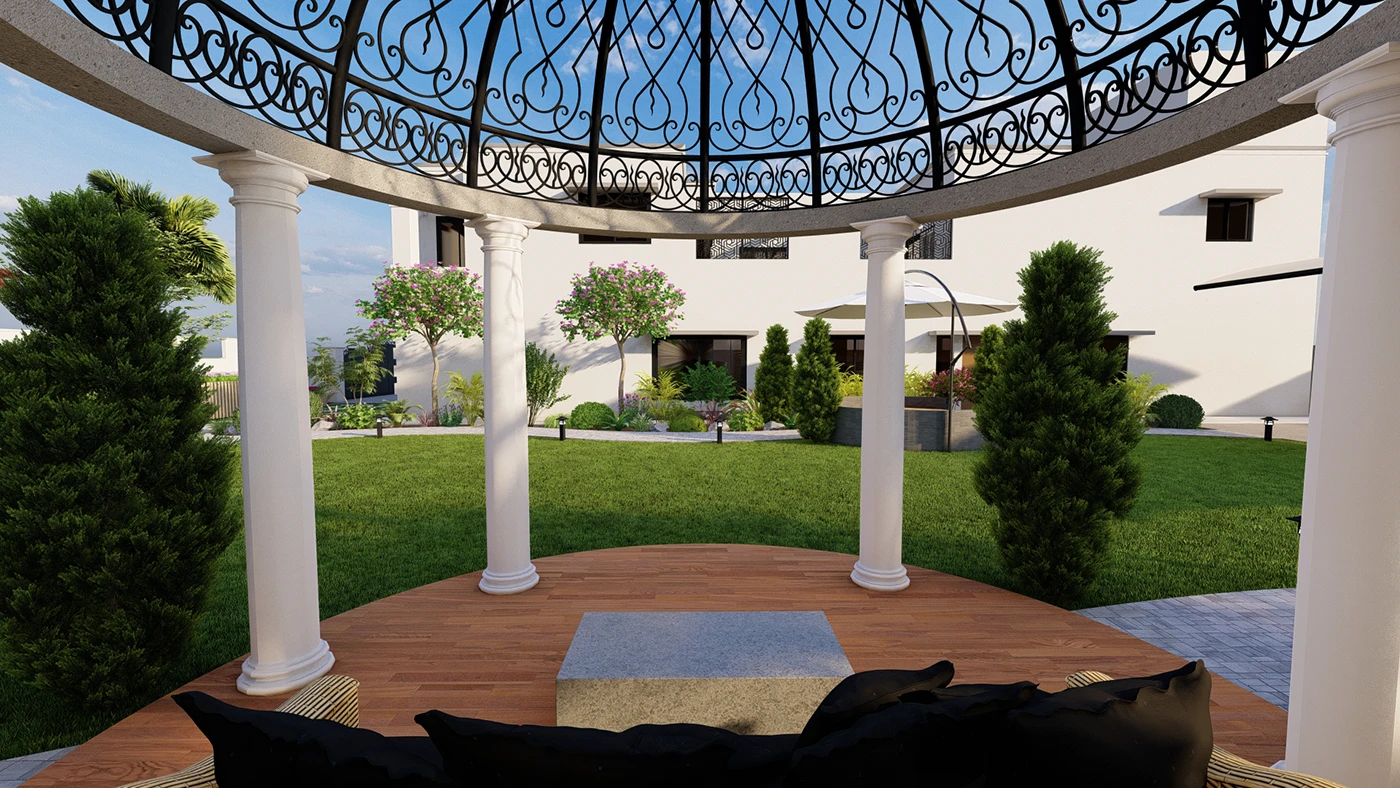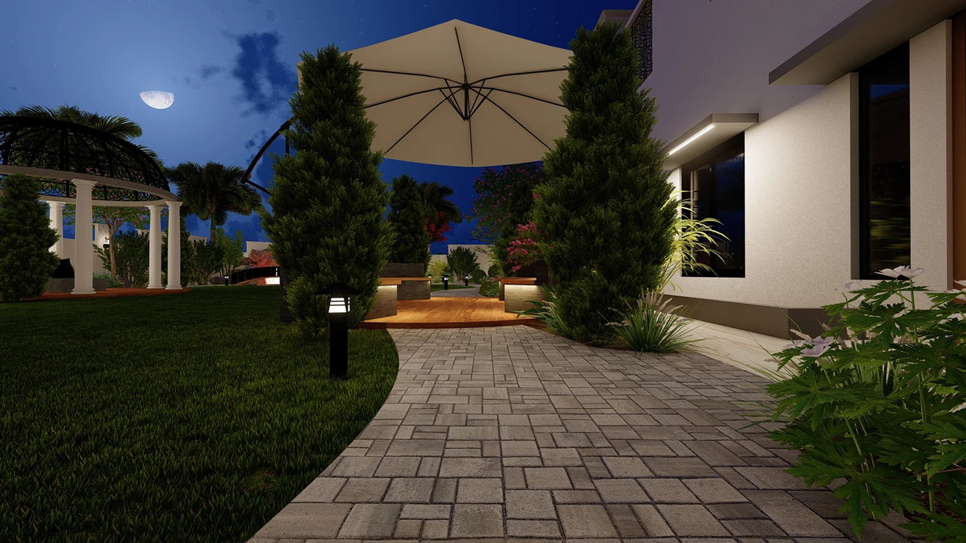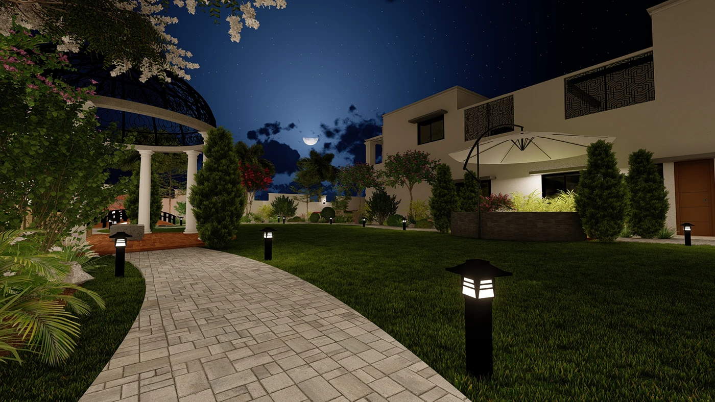 Home Lawn, Planters, Paved Pathways, Grid Stone Pathway, Parking Shed, Dome Pergola with Featured Wall, Bridge, Natural Waterfall, Circular Sitting with Umbrella, Korean Carpet Grass